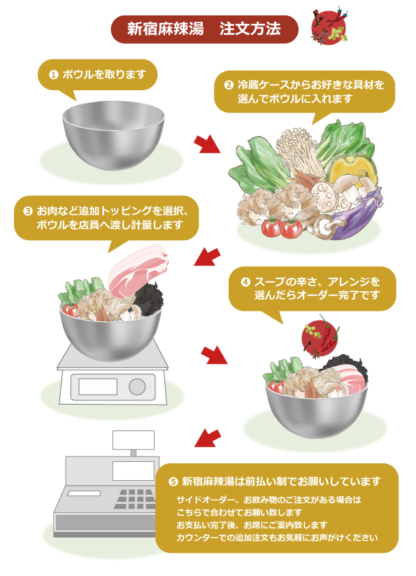 注文方法ボウルに具材を選ぶ→辛さと麺を伝える→先にお会計→席で待つ